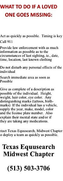 EquuSearch Midwest is a search & recovery team that searches for missing persons across the midwestern United States. We are a branch of Texas EquuSearch. Since our founding in 2012, we have been determined to make an impact on the world through our volunteer based non profit organization. The core of our efforts is to bring our team’s dedication and passion to help find missing loved ones. We have several years of experience, and have worked on many cases with a great track record. We collaborate closely with law enforcement and families of the missing. We have many connections and resources available to conduct large scale organized searches. All of our services are free of charge and include search & recovery missions, evidence recovery and mapping. We search for missing persons of all categories, including silver alerts, high risk & endangered. We utilize searchers on foot, ATV, sonar, drone and any other suitable technologies and methodologies needed. We also partner with other teams including K-9 units and equestrian teams to help further our purpose. Through all of our endeavors we hope to display the conviction behind our beliefs, and bring closure to as many families as possible. "Lost is Not Alone"